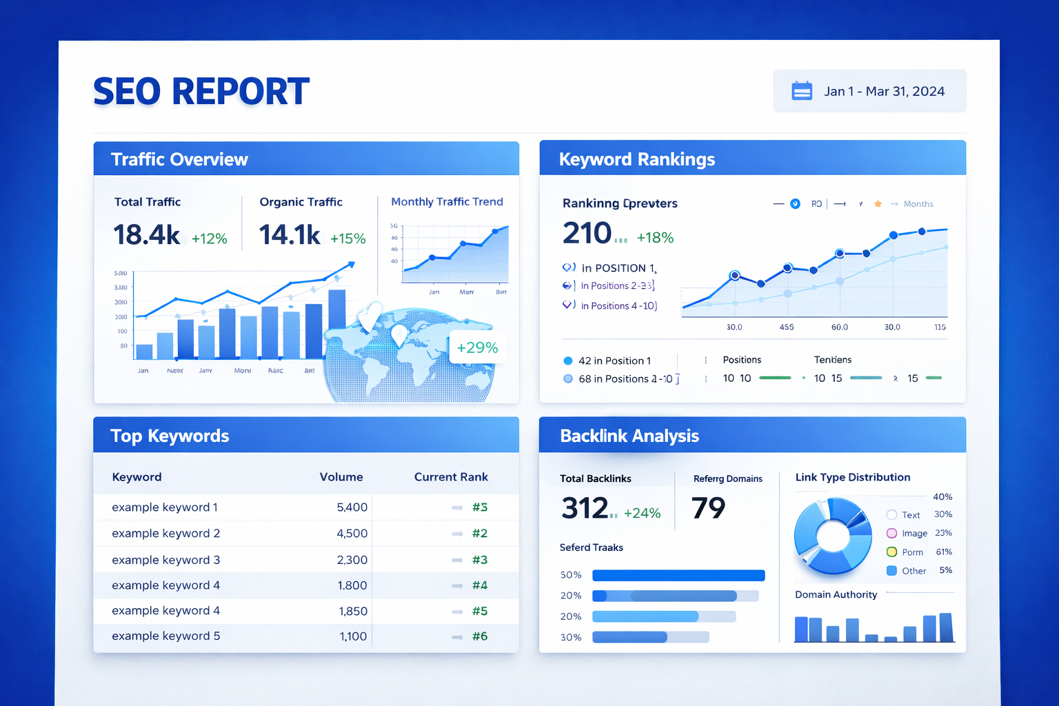 Get clear, actionable insights with our tailored SEO reports. We track keyword rankings, traffic sources, user behavior.